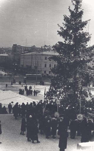 В этом году новогодняя красавица столицы выглядела так же мило и просто, как и в прошлом. Это связано с тем, что то время было не принято использовать яркие украшения. Елку разместили возле метро Крещатик. По сравнению с современной, она намного меньше и тоньше.