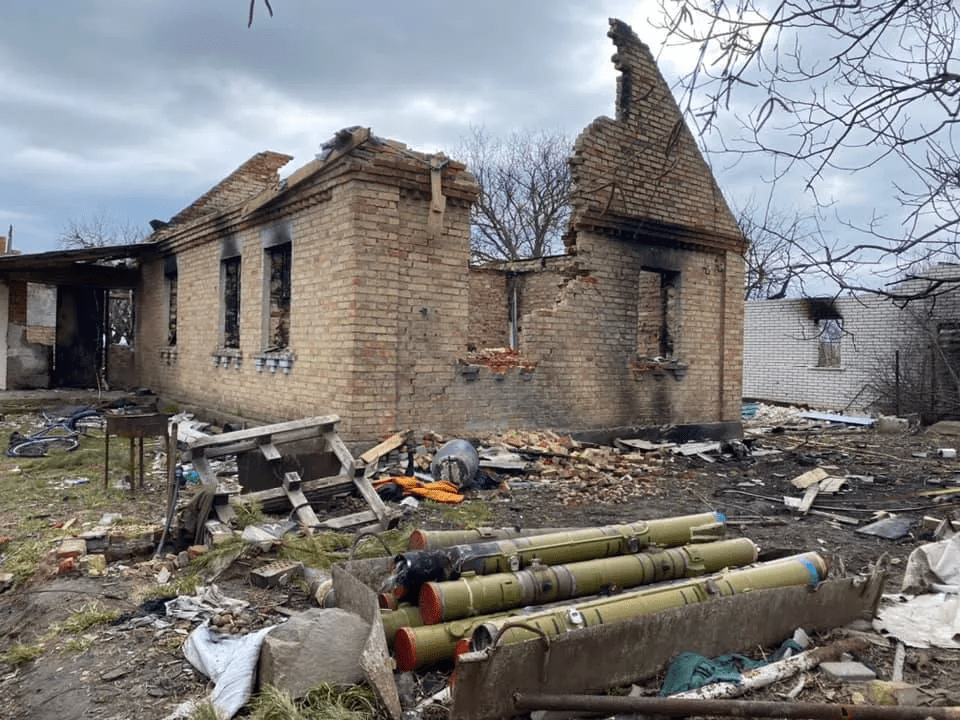 Россияне по приказу своего руководства сожгли деревню, поэтому повсюду заметны масштабные разрушения. Местные жители уже начали постепенно заново строить свое жилье, а также при возможности восстанавливать некоторые его части.