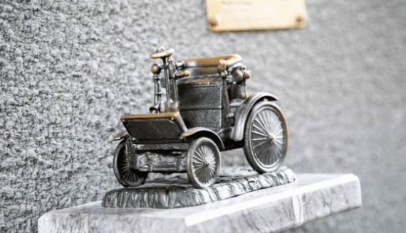В 1897 году состоялось грандиозное событие в истории Киева — по улицам Подола впервые проехал экипаж с 3 людьми. Передвижение осуществлялось за счет газового двигателя. Это транспортное средство изображает фигурка по адресу: Крещатик, 15/4.