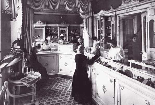 При этом первая аптека не была похожа на серьезное медицинское заведение. Кроме лекарств в ее ассортименте были кухонные товары: сковородки, котлы для плавления воска, медные ступки, шпатели…Они были расположены отдельно от лекарств. А с другой стороны на полках за стеклянными окнами находились кондитерские изделия — торты, выпечка…Поэтому аптека дореволюционных времен больше напоминала магазин, где продавалось много разных товаров для дома.