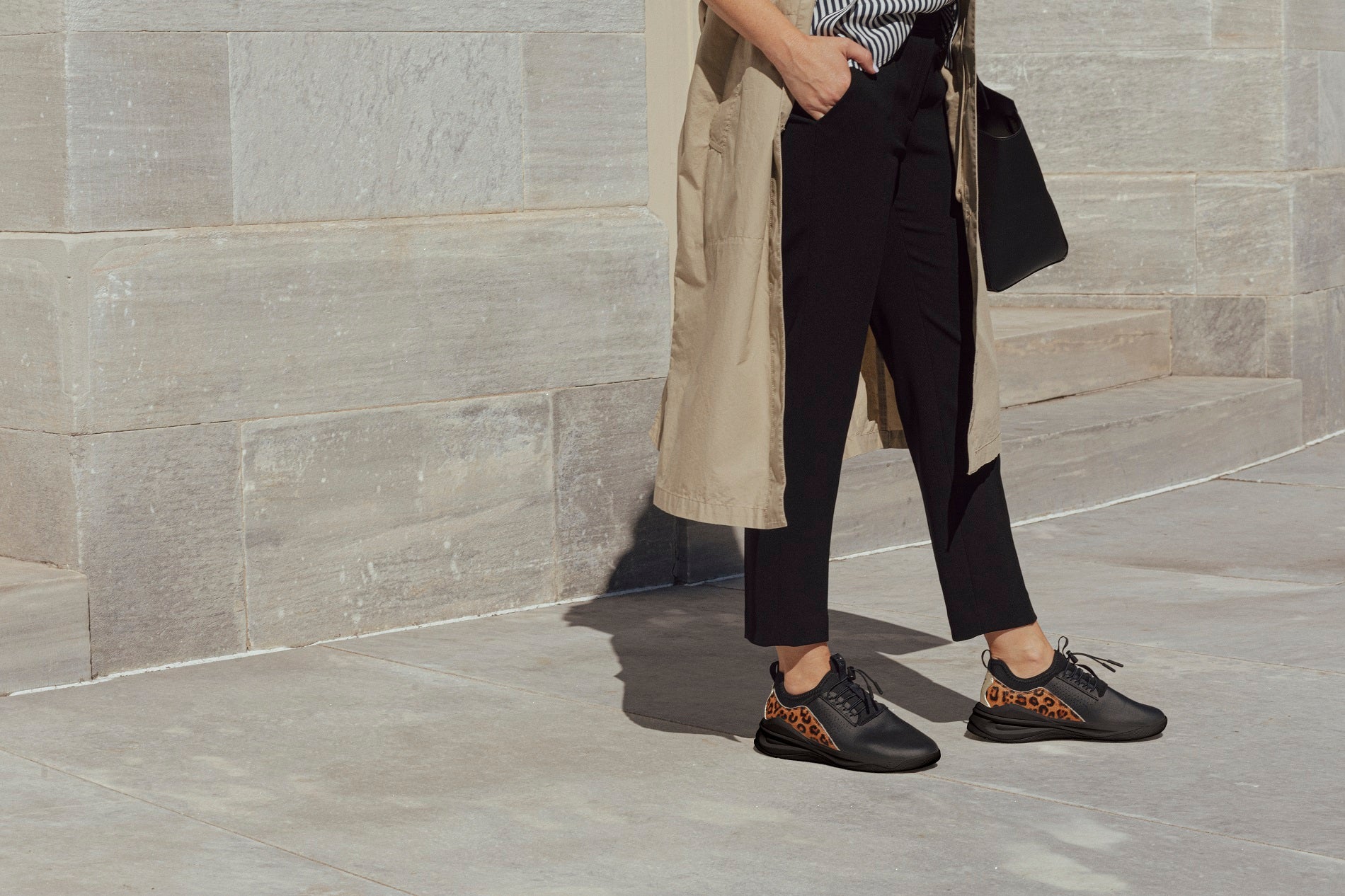 - Класичні брюки та кеди. Це поєднання дозволяє створити елегантний, але неформальний образ. Наприклад, класичні чорні брюки, біла сорочка та кеди — ідеальний варіант для офісу, де немає строгого дрес-коду.