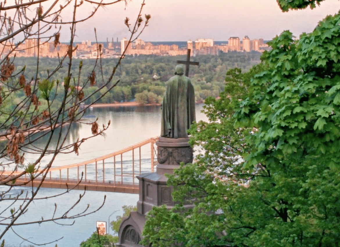 Якщо будете тримати шлях вперед, то зможете дістатись до оглядового майданчика із видом на Дніпро, а спустившись побачите памʼятник князю київському Володимиру про який ходить чимало чуток.