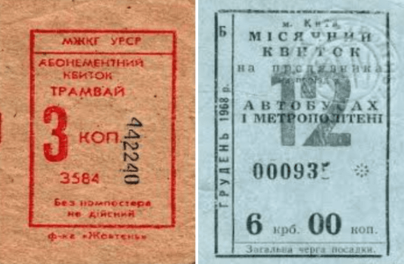 Протягом усієї історії існування громадського транспорту кияни користувалися проїзними та талонами. Але вони постійно змінювалися так само, як і ціни на проїзд. За радянських часів їх продавали у спеціальних будках, які були розташовані на зупинках. Проїзний можна було купити на 1 місяць, 3 місяці, півроку та рік. Мінімальна вартість становила 1 карбованець. При вході у транспорт проїзний треба було показати водієві. Інакше він мав право не пустити пасажира. З проїзним можна було їздити у 3 видах транспорту: автобусі, тролейбусі і трамваї.