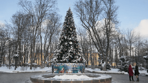 Це місце можна назвати великою країною Святого Миколая! Тут встановлена висока ялинка із традиційними новорічними прикрасами. Також у парку є фотозона, в якій можна зробити гарні фото, а ще спробувати нові страви біля фуд-картів.